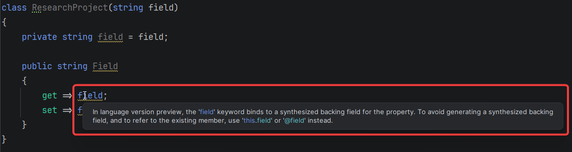 However, when updating your project to use C# 14, you’ll run into the following warning, indicating that using the field keyword inside the accessor will reference a compiler-generated field rather than the existing `field` member.