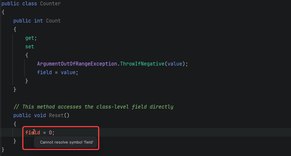 }When you refactor the class to use the field keyword, you’ll run into the following error if you try set the underlying field value in a method: